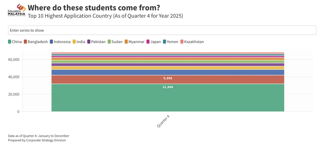 2025年,中国学生以31,866份申请量稳居第一,远超第二名的孟加拉国(9,998份)。全年中国学生总申请量更是高达 75,434份,占国际生总数的近三分之一。值得注意的是,中国学生申请量在连续五年增长后,2025年首次出现小幅回落,从2024年的33,216份(五年峰值)下降约5%。尽管如此,中国依然是马来西亚最重要的生源国,其申请量接近其后多个主要生源国的总和。整体上,马来西亚形成了以中国为核心、南亚与东南亚国家为重要支撑、并逐步向中亚、非洲延伸的多元生源格局。
