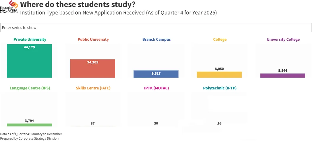根据2025年Q4数据,马来西亚国际学生申请呈现多元化趋势。专业申请排名前三分别为:社会科学、商科与法律共19,030份,理科、数学与计算机共18,963份,综合课程共11,445份。此外,农业与兽医、工程、健康与社会福利等专业也表现出较强潜力,显示出马来西亚教育的专业广度。