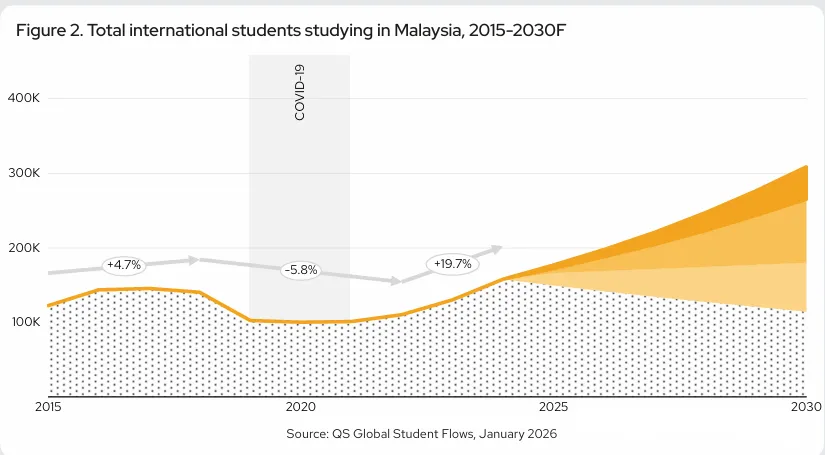 中国学生持续领跑:2024年约占马来西亚国际生总数的40%,达6万人;预计未来五年仍将保持13%的年均增长。
