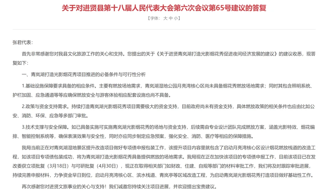 近日,相关单位公布了《关于进贤青岚湖打造光影烟花秀促进夜间经济发展的建议》的建议答复。