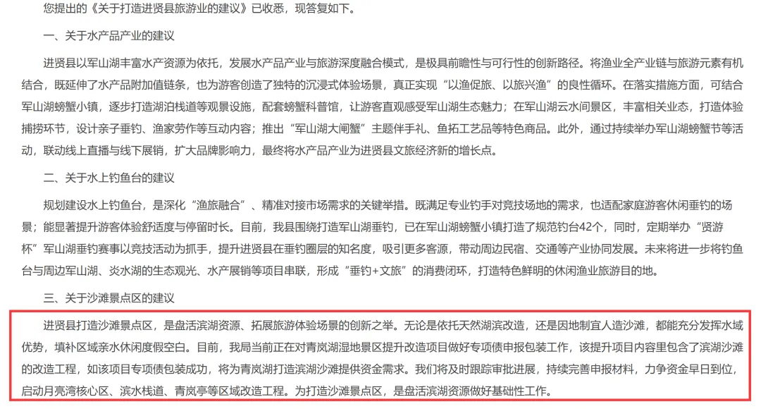 进贤县打造沙滩景点区,是盘活滨湖资源、拓展旅游体验场景的创新之举。无论是依托天然湖滨改造,还是因地制宜人造沙滩,都能充分发挥水域优势,填补区域亲水休闲度假空白。目前,我局当前正在对青岚湖湿地景区提升改造项目做好专项债申报包装工作,该提升项目内容里包含了滨湖沙滩的改造工程,如该项目专项债包装成功,将为青岚湖打造滨湖沙滩提供资金需求。我们将及时跟踪审批进展,持续完善申报材料,力争资金早日到位,启动月亮湾核心区、滨水栈道、青岚亭等区域改造工程。为打造沙滩景点区,是盘活滨湖资源做好基础性工作。