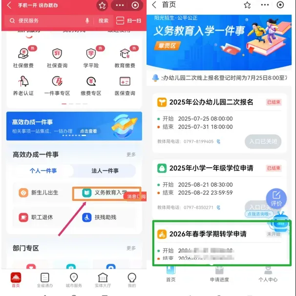 打开支付宝搜索“赣服通”或者直接下载“赣服通”→点击下方“义务教育入学”→选择赣州市章贡区→“2026年春季学期转学申请”进入信息登记操作。