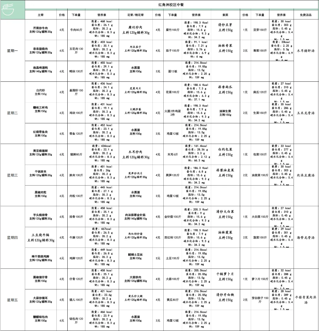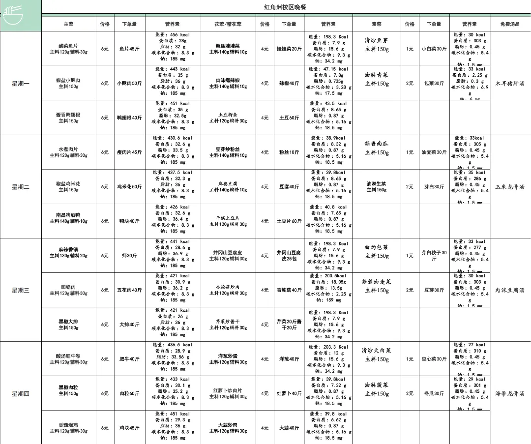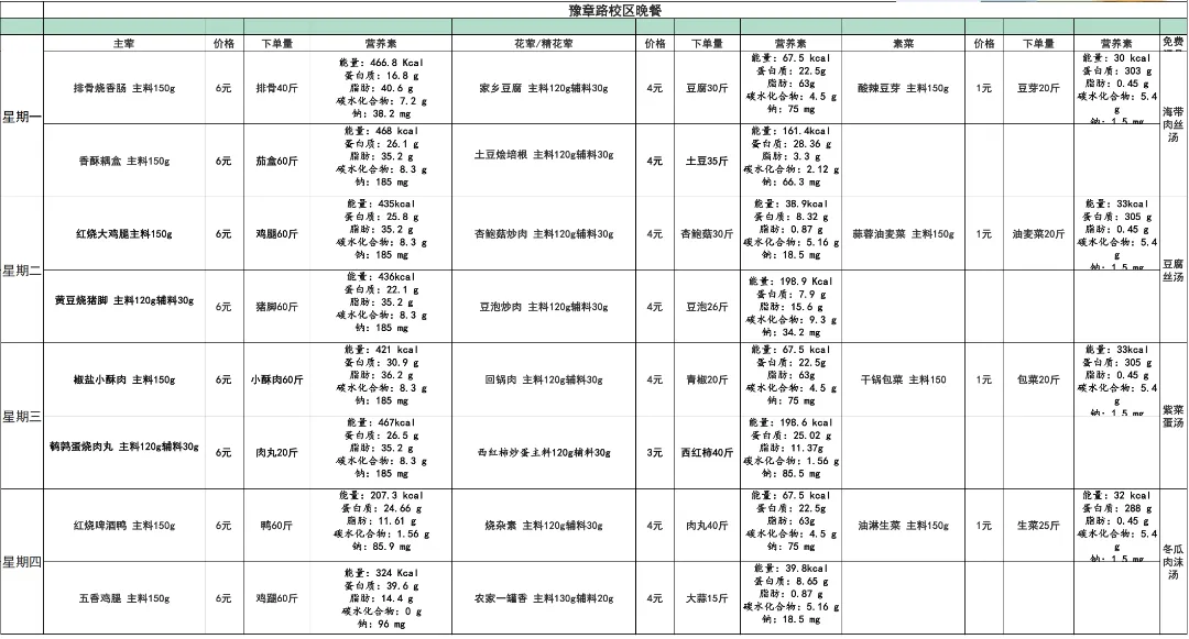 健康小贴士:期末复习能量消耗大,黑椒大排、花菜肉片提供充足优质蛋白,玉米龙骨汤中的复合碳水能带来持久饱腹感。蒜香南瓜富含β-胡萝卜素,搭配油淋生菜补充维生素,助力高效复习,快速恢复精力。