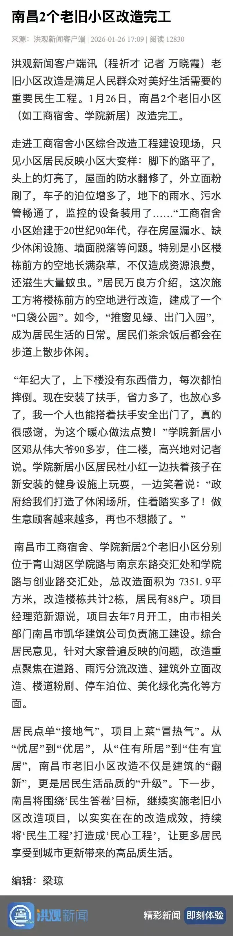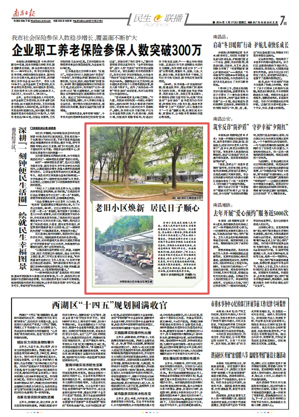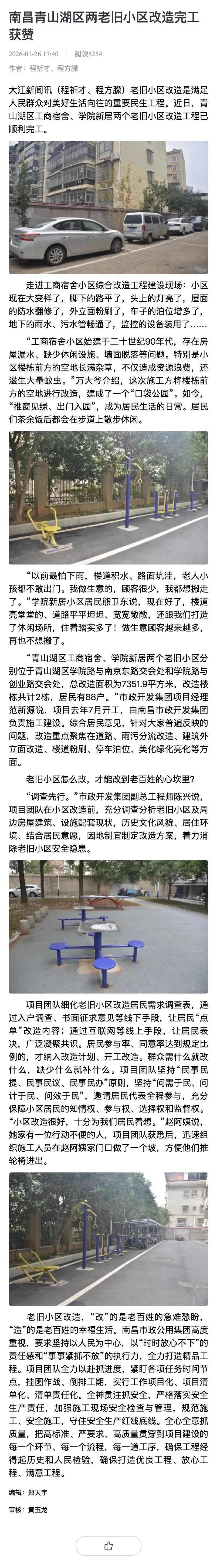 老旧小区改造是造福人民群众、满足人民群众对美好生活需要的重要民生工程。1月26日,记者获悉,青山湖区工商宿舍、学院新居两个老旧小区改造完工。“青山湖区工商宿舍、学院新居两个老旧小区分别位于青山湖区学院路与南京东路交会处、学院路与创业路交会处,改造总面积为 7351.9平方米,改造楼栋共计2栋,居民有88户。”项目施工方南昌市凯华建筑公司项目经理范新源说,项目去年7月开工。综合居民意见,针对大家普遍反映的问题,改造重点聚焦在道路、雨污分流改造、建筑外立面改造、楼道粉刷、停车泊位、美化绿化亮化等方面。