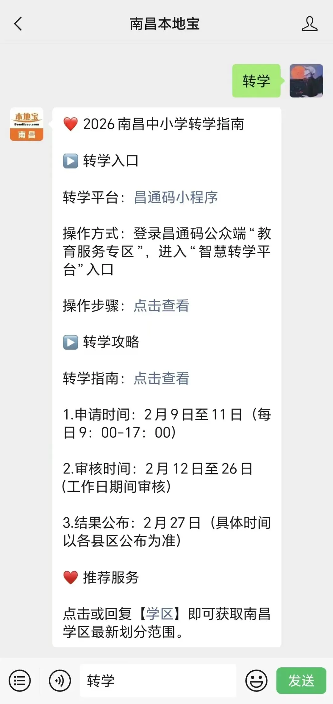 南昌本地宝推出非常多的功能,进入【南昌本地宝】公众号聊天对话框里,点击发消息,在对话框内输入并发送对应的【关键词】即可获取相关内容。