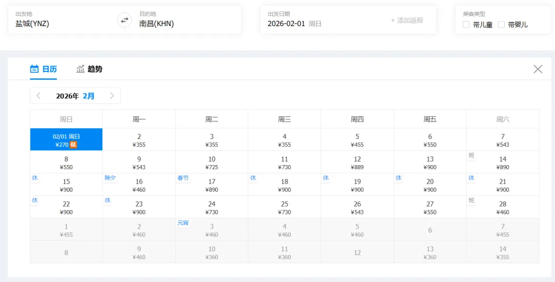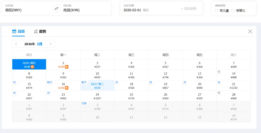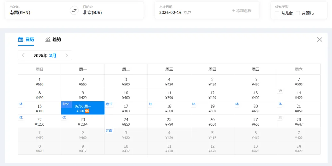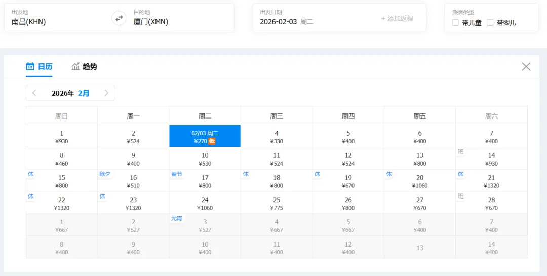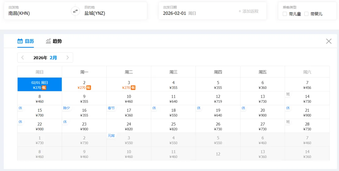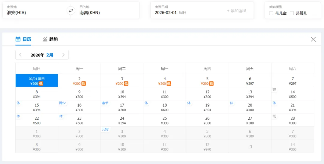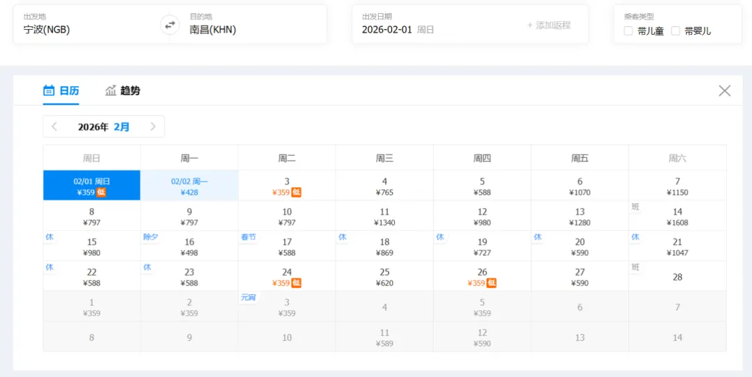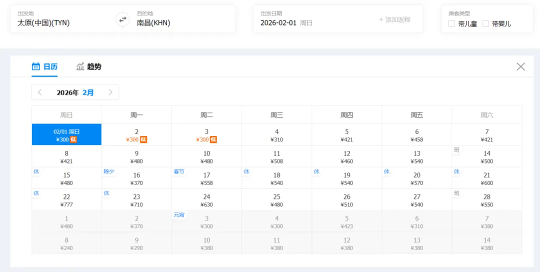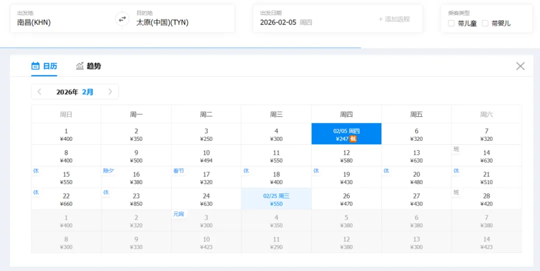 ①“去程最低价/返程最低价”指的是2026年2月1日-2月28日期间特价机票。
