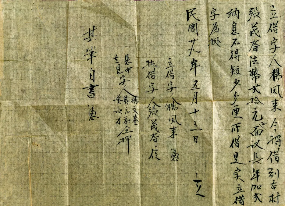 立借字人杨凤来,今将借到本村张茂春法币贰拾元正,面议长年加贰纳息,不得短少分厘。所借是实,立借字为据。民国廿十九年五月十五日立。立借字人杨凤来凭,执借字人张茂春信。凭中在见字人杨文奎、黄元和、黄长才仝押。其笔自书凭。