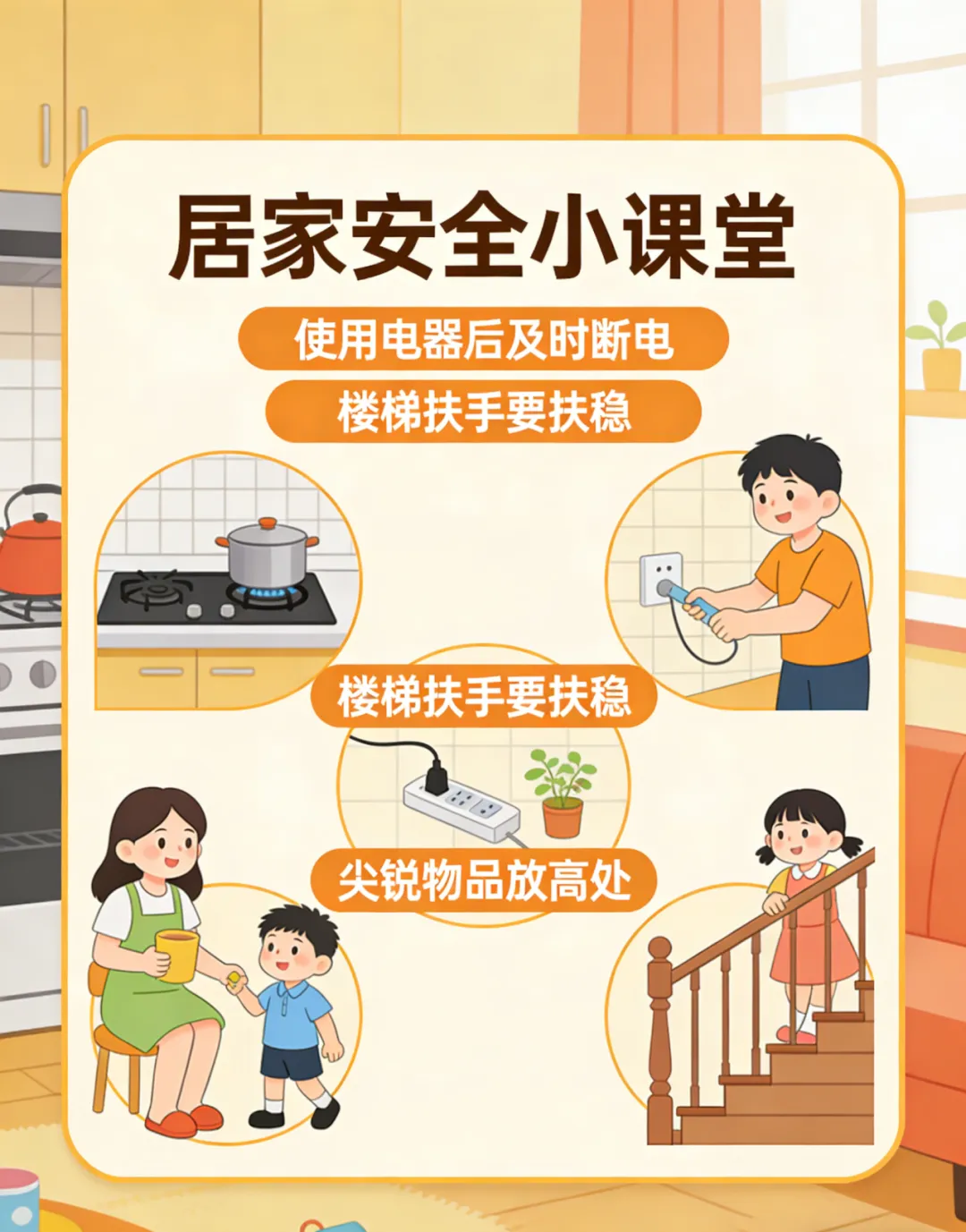 检查家中电器线路,教育孩子不玩火、不随意触碰插座;