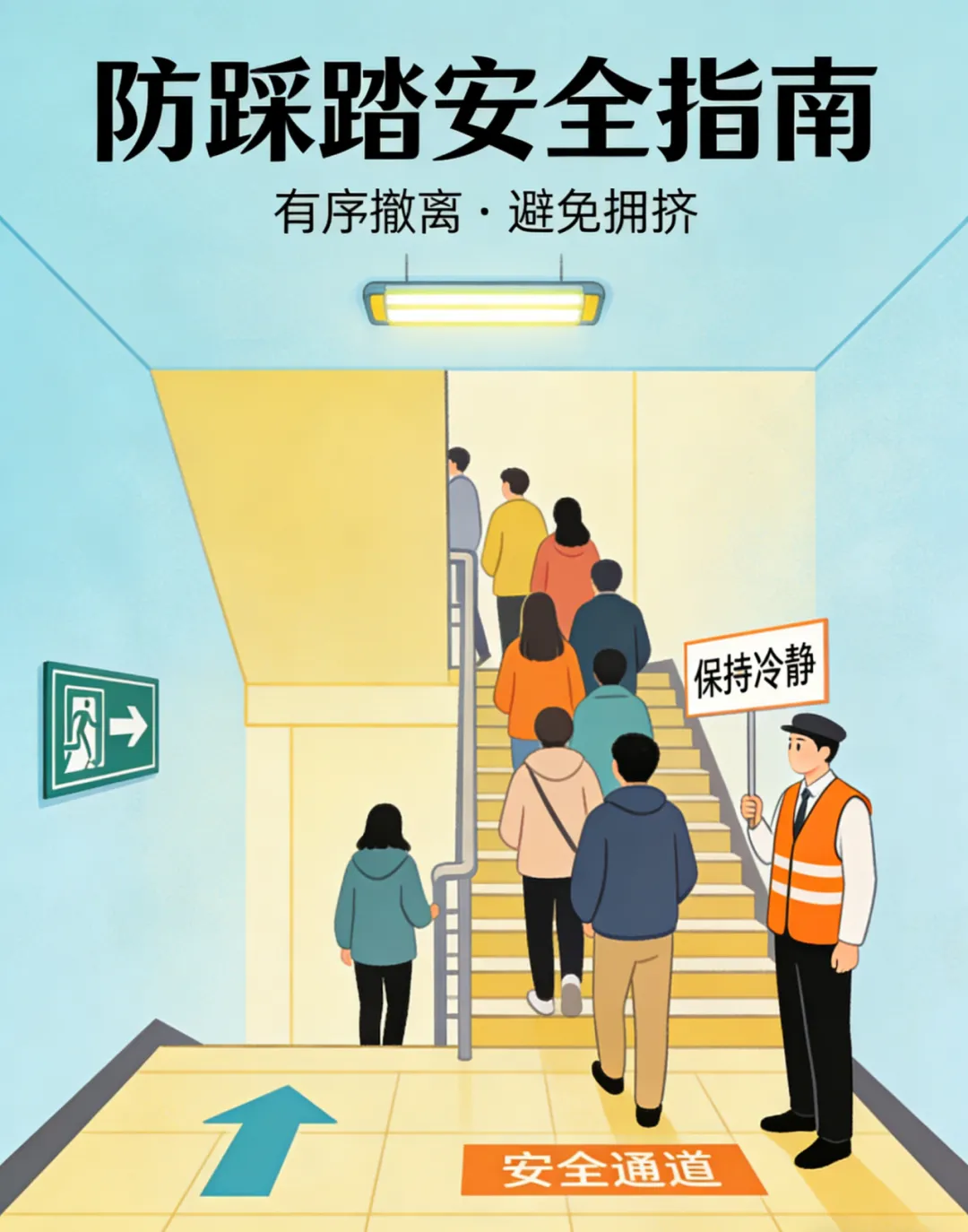 如遇拥挤,保持冷静,顺着人流移动。