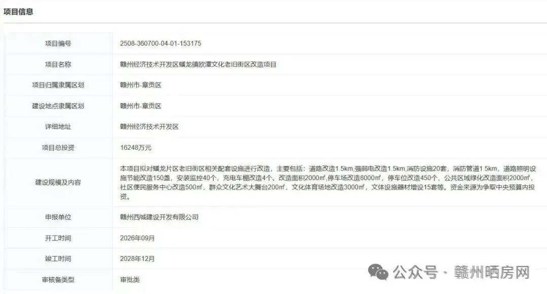 ,总投资16248万元,由赣州西城建设开发有限公司申报,计划开工时间2026年09月,竣工时间2028年12月。