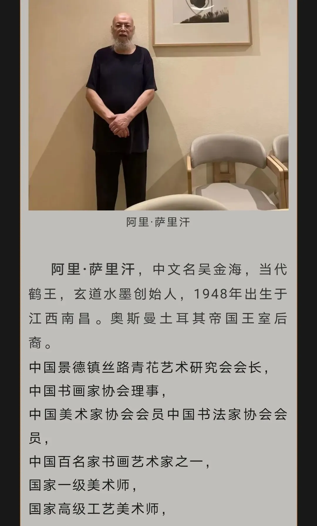 阿里·萨里汗,中文名吴金海,1948年出生于江西南昌,自称土耳其帝国王室后裔。他现任景德镇丝路青花艺术研究会会长、中国书画家协会理事,拥有国家一级美术师和国家高级工艺美术师职称,作品多次在日本展出并获奖,被誉为"当代鹤王",创立了"玄道水墨"画风,擅长以仙鹤、墨龙、墨竹及达摩、观音等宗教人物为题材进行创作。