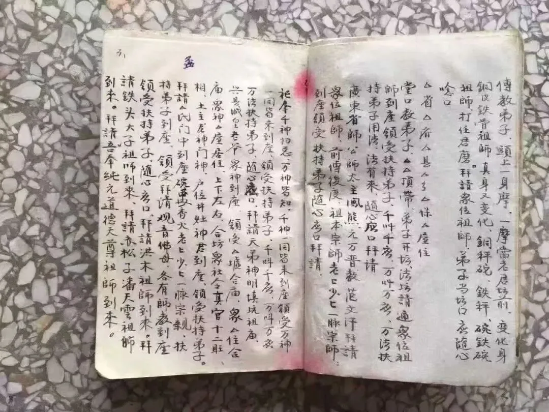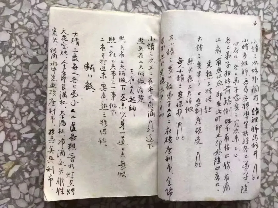 《赣州兴国民间符咒》清代手抄本,道家符咒秘法相关书籍。内容包含:请神三次,小咒神三次,无三牲就茶酒小请三次,端起大碗水咒教请连咒三次,化大碗水祖师令,点兵,坊前口教弟子,寄身土埋藏,做师傅归坛前,断口教,请太上老君,竹青符,治痛灵符,治肚痛,观音咒语,大将军押煞,男人吐血不止方,神鬼,九龙下海,符咒,制白蚁用,焚香咒,净水咒,催生,招兵,床保境,和合符,收用人心的东西,收总符和咒告和神咒等