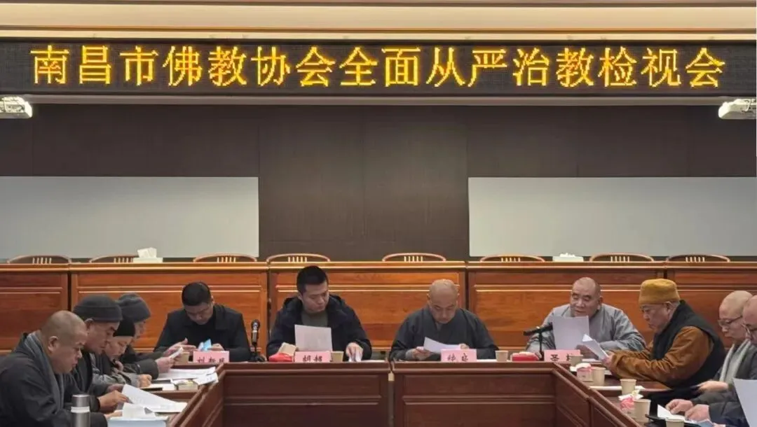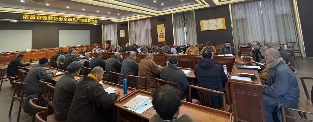 为推进佛教中国化、强化团体自身建设、守住宗教领域安全底线,南昌市佛教协会于2026年1月28日召开从严治教检视会及常务理事述职会议,全体常务理事、教风委成员及部分信众代表参会,南昌市民宗局宗教科胡超、刘新民同志出席指导。