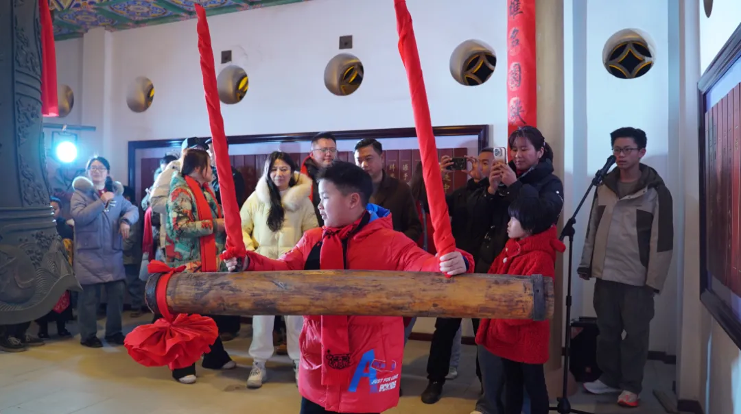 游客排队撞钟,每人限撞3下,工作人员同步唱和寓意:“一撞一鸣惊人,学业事业节节高;二撞双喜临门,平安顺遂常相伴;三撞三元及第,马年大吉福满门”。