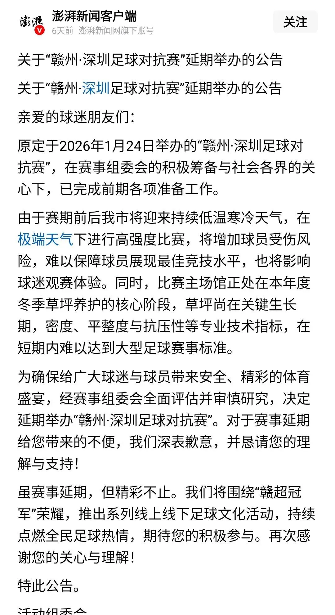 我为什么会吧平平无奇的一天,传上网络与诸君分享呢?原因是我今天上网冲浪,看到了一个让我惊掉下巴的公告。原定于1月24号举办的赣州.深圳足球对抗赛,因为“持续低温,极端天气,草坪维护”等原因延期举办。至于延期到啥时候举办,公告里面没有说,咱也不知道。