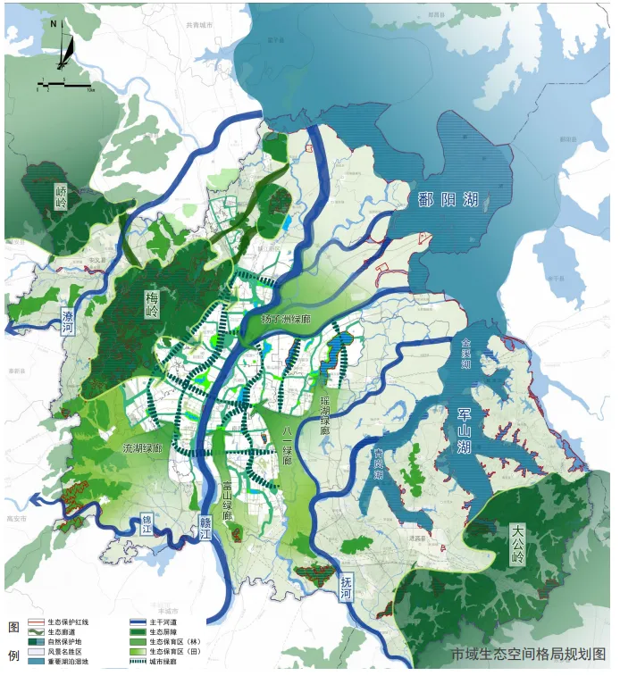 将“西山东水、北洲南泽”四片近郊特色魅力生态空间嵌入到城市核心区,营造城市与人文自然生态交错的空间结构;