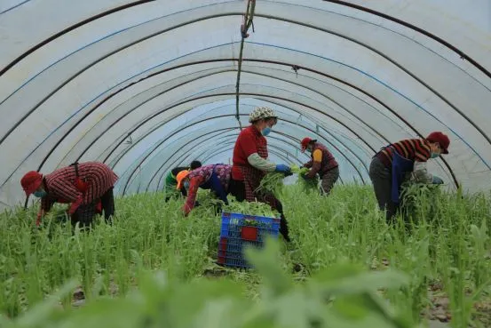 (富山乡农户采摘凉麦菜)了解到菜农的这些顾虑,富山乡每周一组织送农资下乡活动,通过征集订单方式将农资配送到各村。