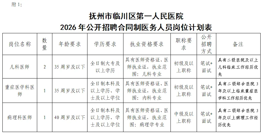 抚州市临川区第一人民医院2026年面向社会公开招聘合同制医务人员4名,其中儿科医师2名,重症医学科医师1名,病理科医师1名(具体岗位要求详见附件1)。