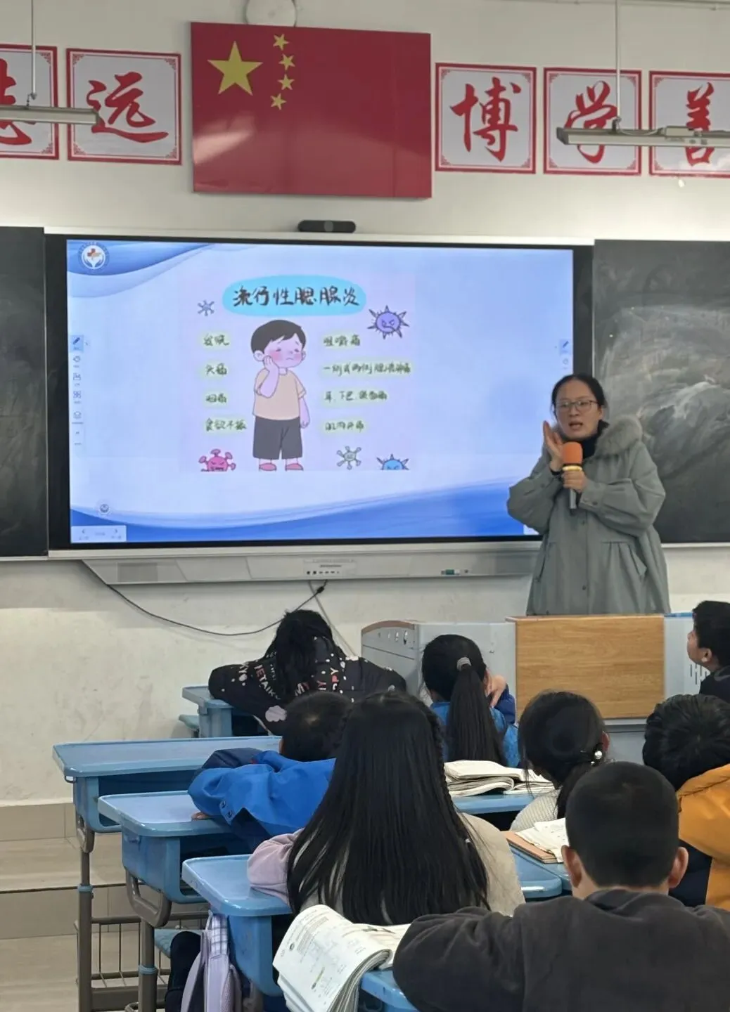 三年级家长细心讲解秋冬传染病预防知识,健康意识在孩子们心中悄然生根。