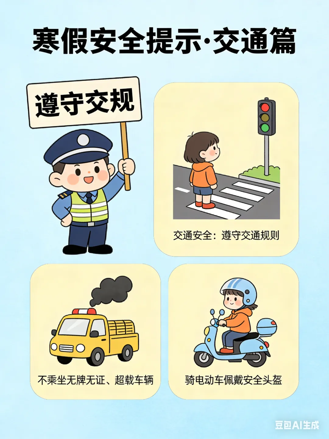 1. 交通安全:寒假出行注意交通安全,遵守交通规则,不乘坐无牌无证、超载车辆;未满16周岁严禁骑行电动车、摩托车上路;年满16周岁骑行电动车,须全程佩戴安全头盔,且严禁载人。请全体同学严守交规,安全出行。