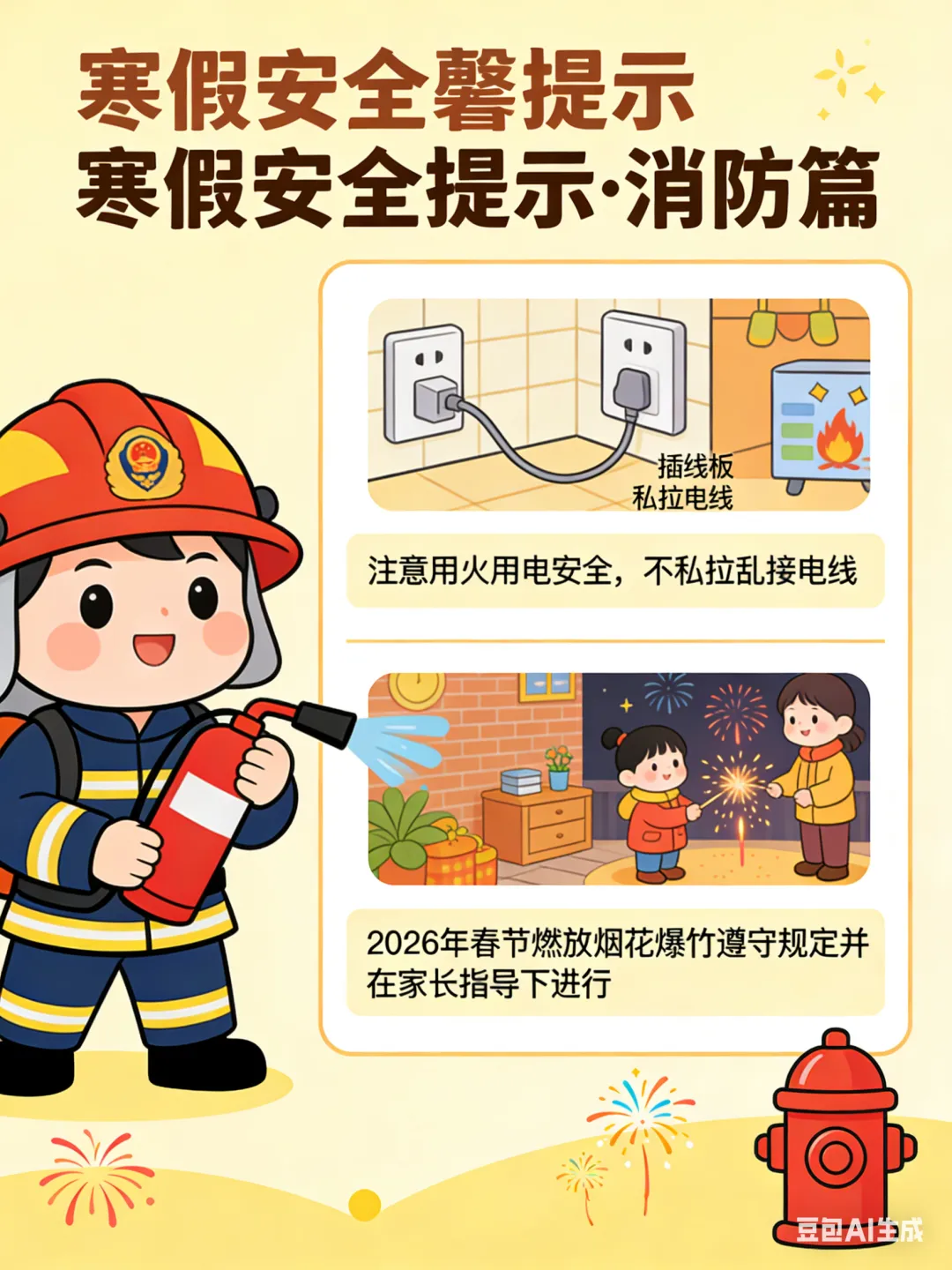 2. 消防安全:注意用火用电安全,不私拉乱接电线;春节期间燃放烟花爆竹需遵守当地规定,在家长指导下安全进行。