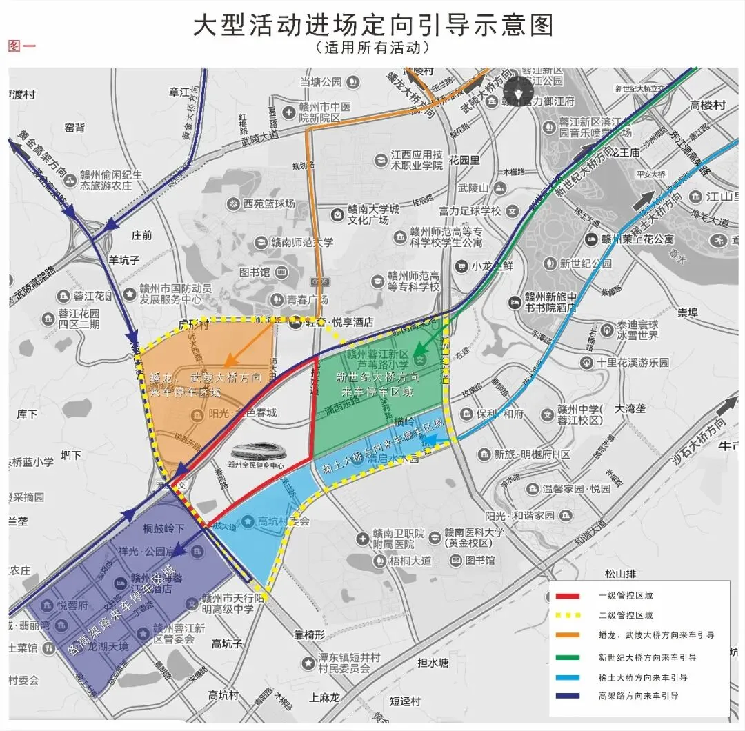 稀土大桥方向前往鸟巢,可停放在进场示意图中蓝色区域内,建议停车位置有:医科大校内,平安大道,薄荷路,梅花路,新世纪大道(赣南大道平安大道段),停车后步行前往鸟巢。