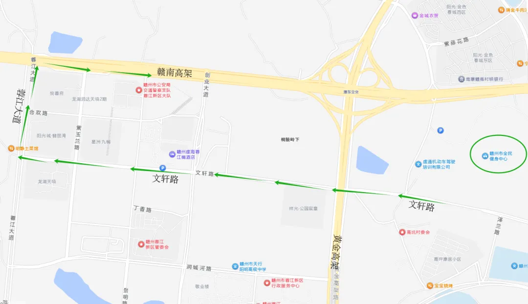 腾飞大道上高架路口如遇较多车辆时,前往章贡区,经开区的车辆可前往蓉江大道右转上赣南高架,具体路线如下: