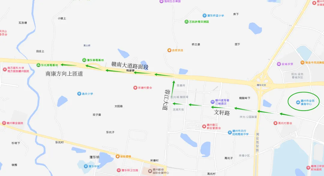 前往南康区的车辆可在蓉江大道路口左转,沿赣南大道路面段行驶至潭东大道上匝道进入高架,具体路线如下: