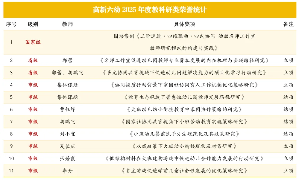 我园教师团队深耕教育科研领域,在省、市级课题研究中成果丰硕。一批课题成功立项,一批课题顺利结项,老师们以严谨的研究态度和扎实的实践探索,不断挖掘教育本质,用科研力量驱动教育质量持续提升,为幼儿园的内涵发展筑牢根基。