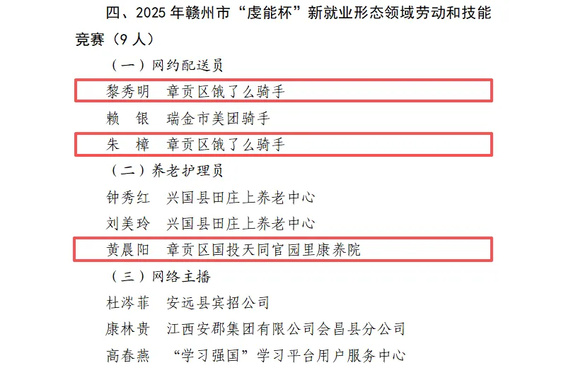此次获评的11名选手来自章贡区信息技术业和现代服务业企业生产一线,他们坚守匠心,争创一流,深耕专业领域多年,分别在2025年赣州市“虔能杯”数字技术创新应用劳动和技能竞赛、新就业形态领域劳动和技能竞赛,以及第三届“赣南家政杯”赣州市家政服务行业职业技能竞赛上取得了优异成绩,为全区广大从业者树立了可学可及的榜样标杆。
