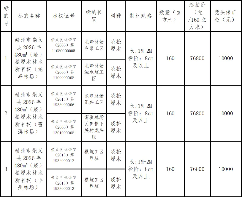 2、本次拍卖标的中的松原木品种为疫木,请各意向流入方务必知晓,谨慎竞拍。意向流入方须是崇义县林业局疫木定点加工备案企业。意向流入方应在本公告期截止前现场踏勘流转标的,就流转标的相关情况主动向转出方咨询,自行了解标的可能涉及的相关法律法规及政策规定;完成登记的意向流入方都视同已实地踏勘流转标的,确认了标的数量并认可流转要求等,自愿承担因上述原因导致的一切后果和法律责任。