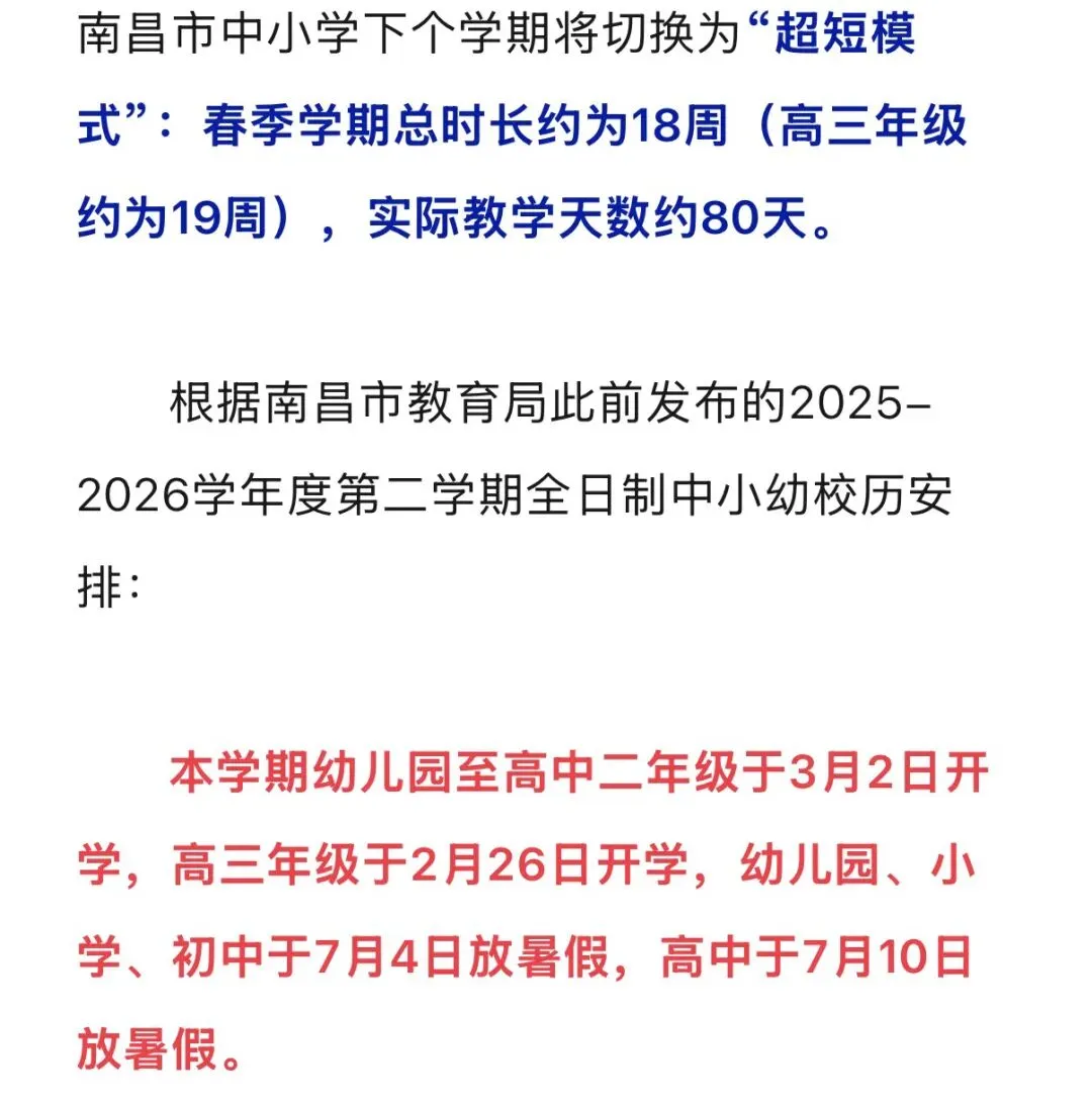 南昌市中小学下个学期将切换为“超短模式”:春季学期总时长约为18周(高三年级约为19周),实际教学天数约80天。