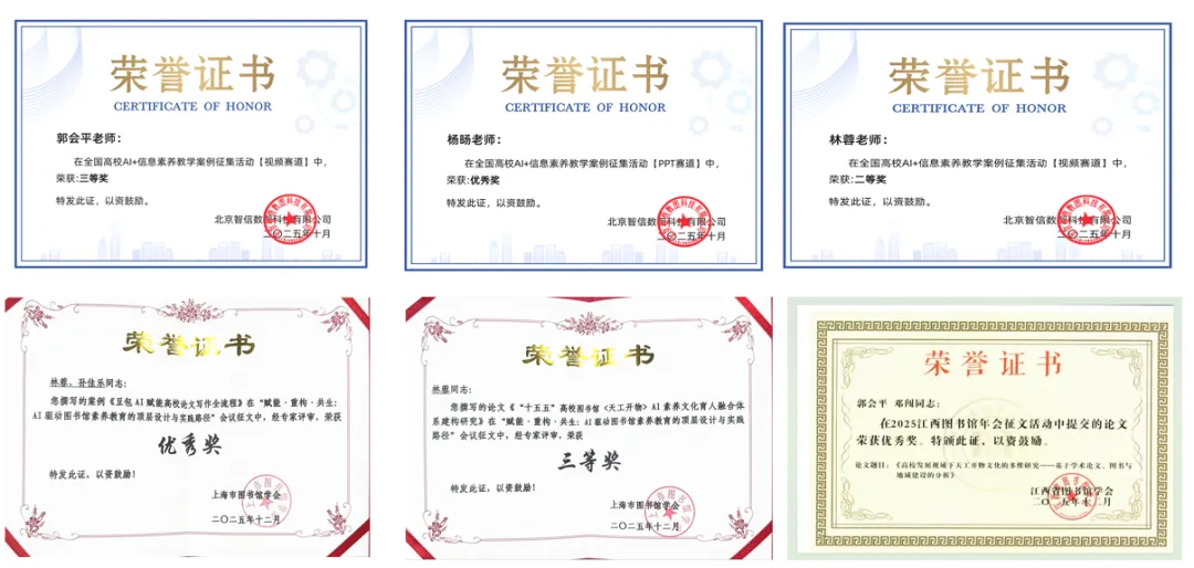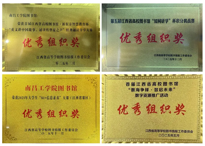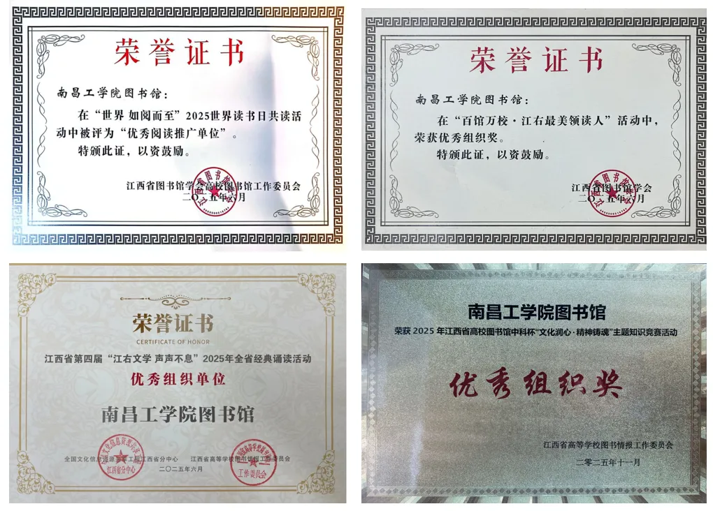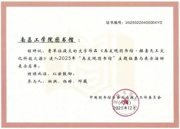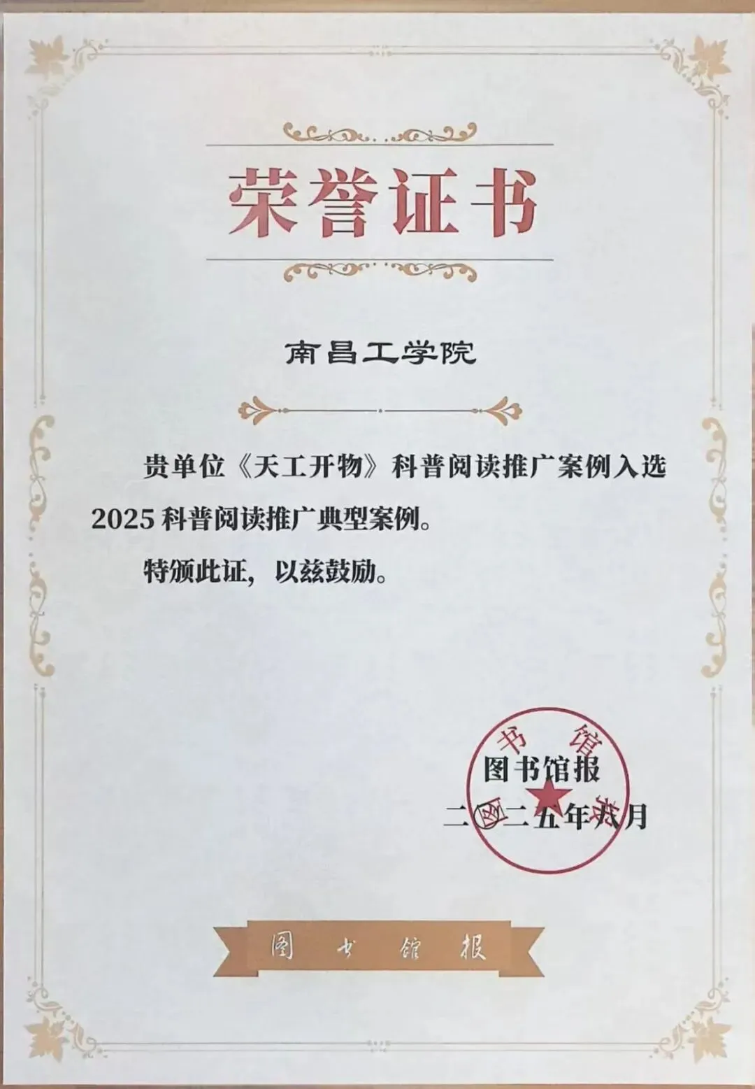 累计获江西省图工委阅读推广“优秀组织奖”8次,优秀指导奖8人次,学生获奖25人次。《再发现图书馆·探索天工文化科技之源》入选中国图书馆学会阅读推广工作委员会举办的2025年“再发现图书馆”展示名单活动。《天工开物》推广案例入选中国《图书馆报》2025科普阅读推广典型案例。