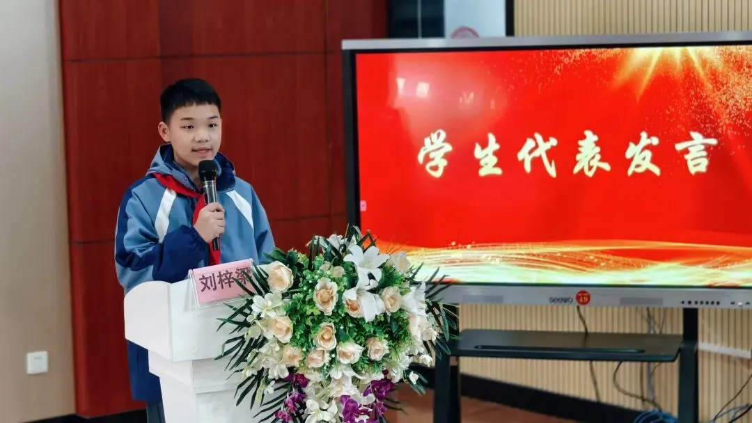 学生代表刘梓梁同学表示感恩父母的鼓励与老师的教导,也庆幸能在学校搭建的良好的平台成长,我将以此次获奖为新起点,坚定信念、刻苦学习,努力成长为德智体美劳全面发展的社会主义建设者和接班人。