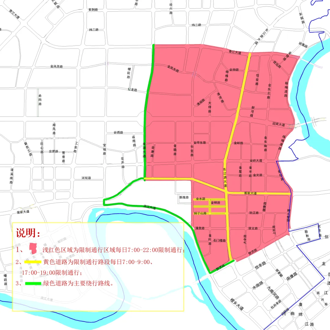 金潭大道(不含)、华坚路(含)和滨江大道(不含)以东,香江大道(含)以南,杨梅渡路(含)、金秋路(含)和登峰大道(含)以西,赞贤路(含)以北的围合区域。注:【赞贤路(东江源大道至滨江大道段)不在限行范围内。】