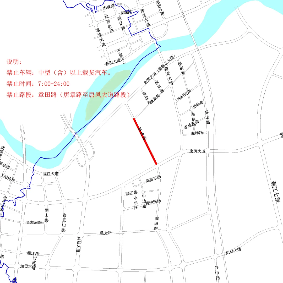 滨江大道(华坚路-黄金大道)实行危化品运输车辆禁止通行的管理措施,禁止运输危险化学品车辆通行。
