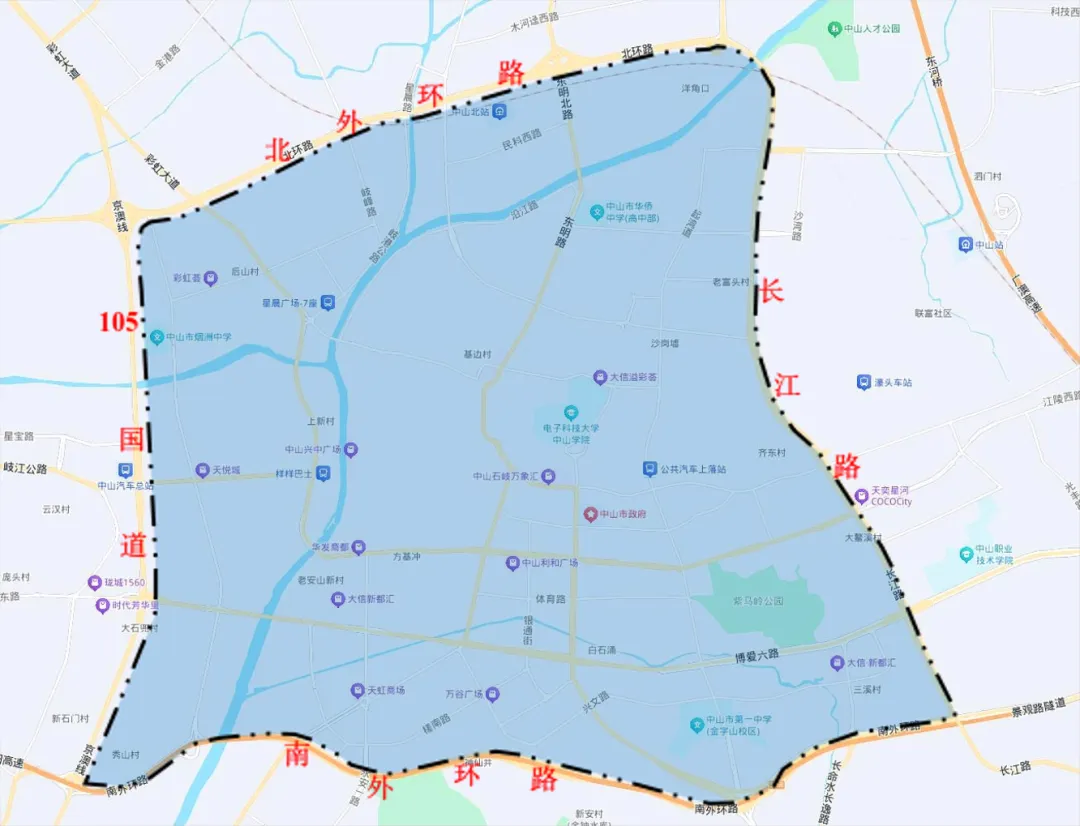 105国道(南起南外环路交叉口,北至北外环交叉口,不含本道路)以东,北外环路(西起105国道交叉口,东至长江路交叉口,不含本道路)以南,长江路(北起北外环路交叉口,南至南外环交叉口,不含本道路)以西,南外环路(东起长江路交叉口,西至105国道交叉口,不含本道路)以北。