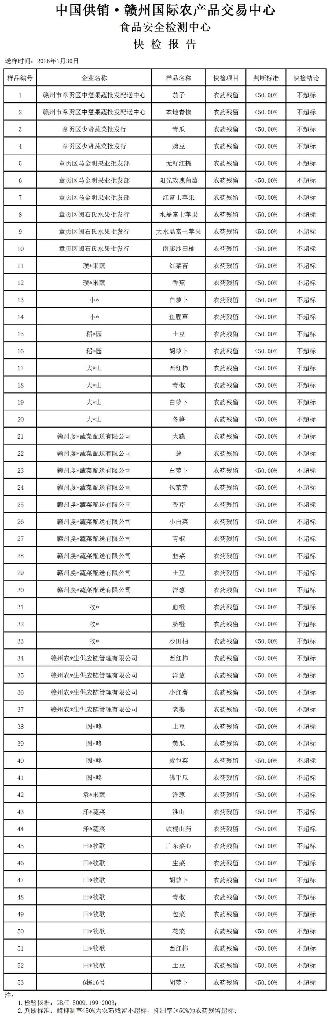 赣州中农批市场2026年1月30日农产品农残抽样检查