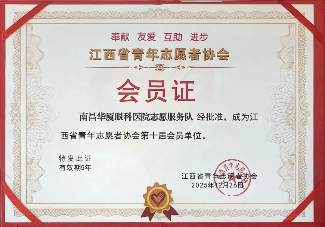 近日,南昌华厦眼科医院志愿服务队经江西省青年志愿者协会批准,正式成为该协会第十届会员单位。这是对我院长期以来积极投身公益、践行社会责任的高度认可,也标志着我院志愿服务工作迈入了新的阶段。
