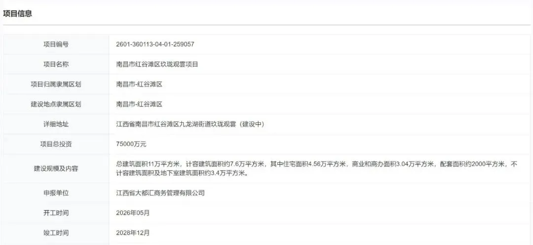 项目总投资75000万元;申报单位为江西省大都汇商务管理有限公司;预计开工时间2026年5月,竣工时间2028年12月。