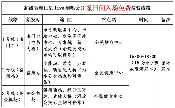 为全力支持超级音雄巨星live演唱会(以下简称演唱会)圆满举办,经研究,演唱会期间临时增开日间入场及夜间散场的免费接驳专线,并调整公交线路运营安排,相关情况如下: