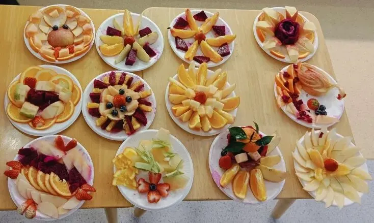 水果拼盘比拼中,保育老师们各显神通,紧扣幼儿食用安全、造型童趣、营养搭配的要求,在食材挑选、色彩搭配、造型构思上巧思不断。