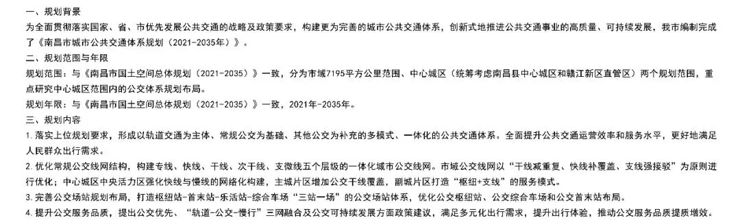 南昌市有关部门公示了南昌市城市公共交通体系规划(2021-2035年)。该规划范围与《南昌市国土空间总体规划(2021-2035)》一致,分为市域7195平方公里范围、中心城区(统筹考虑南昌县中心城区和赣江新区直管区)两个规划范围,重点研究中心城区范围内的公交体系规划布局。落实上位规划要求,形成以轨道交通为主体、常规公交为基础、其他公交为补充的多模式、一体化的公共交通体系。全面提升公共交通运营效率和服务水平,更好地满足人民群众出行需求。