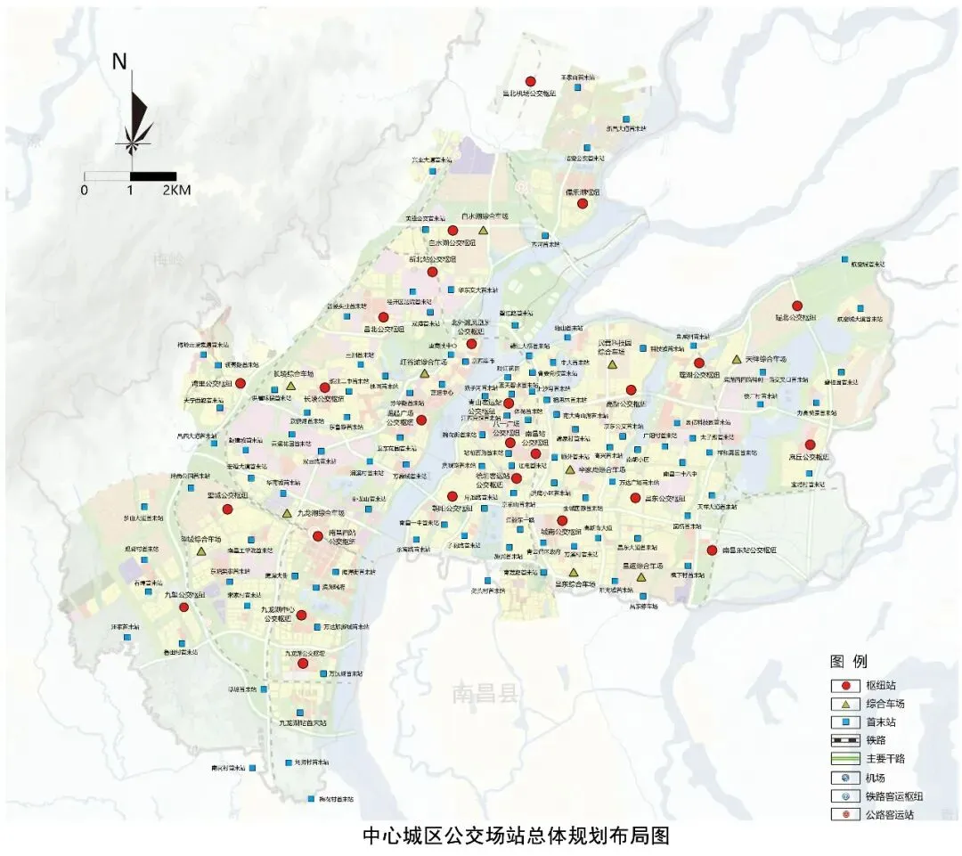 再从南昌市中心城区公交场站总体规划布局图看,其中枢纽站包括九龙湖公交枢纽、九龙湖中心公共枢纽、九望公交枢纽、望城公交枢纽、湾里公交枢纽、长堎公交枢纽、崛起广场公交枢纽、昌北公交枢纽、北外滩凤凰洲公交枢纽、新北站公交枢纽、儒乐湖枢纽、青山客运站、南昌站公交枢纽、朝阳公交枢纽、城南公交枢纽、南昌东站公交枢纽、高新公交枢纽、瑶湖公交枢纽、麻丘公交枢纽、瑶北公交枢纽。
