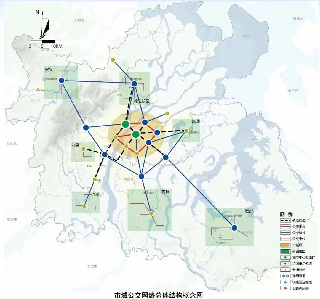 从市域公交网络总体结构概念图看,包括多个组团重点枢纽,其中进贤、安义还规划有通用机场。