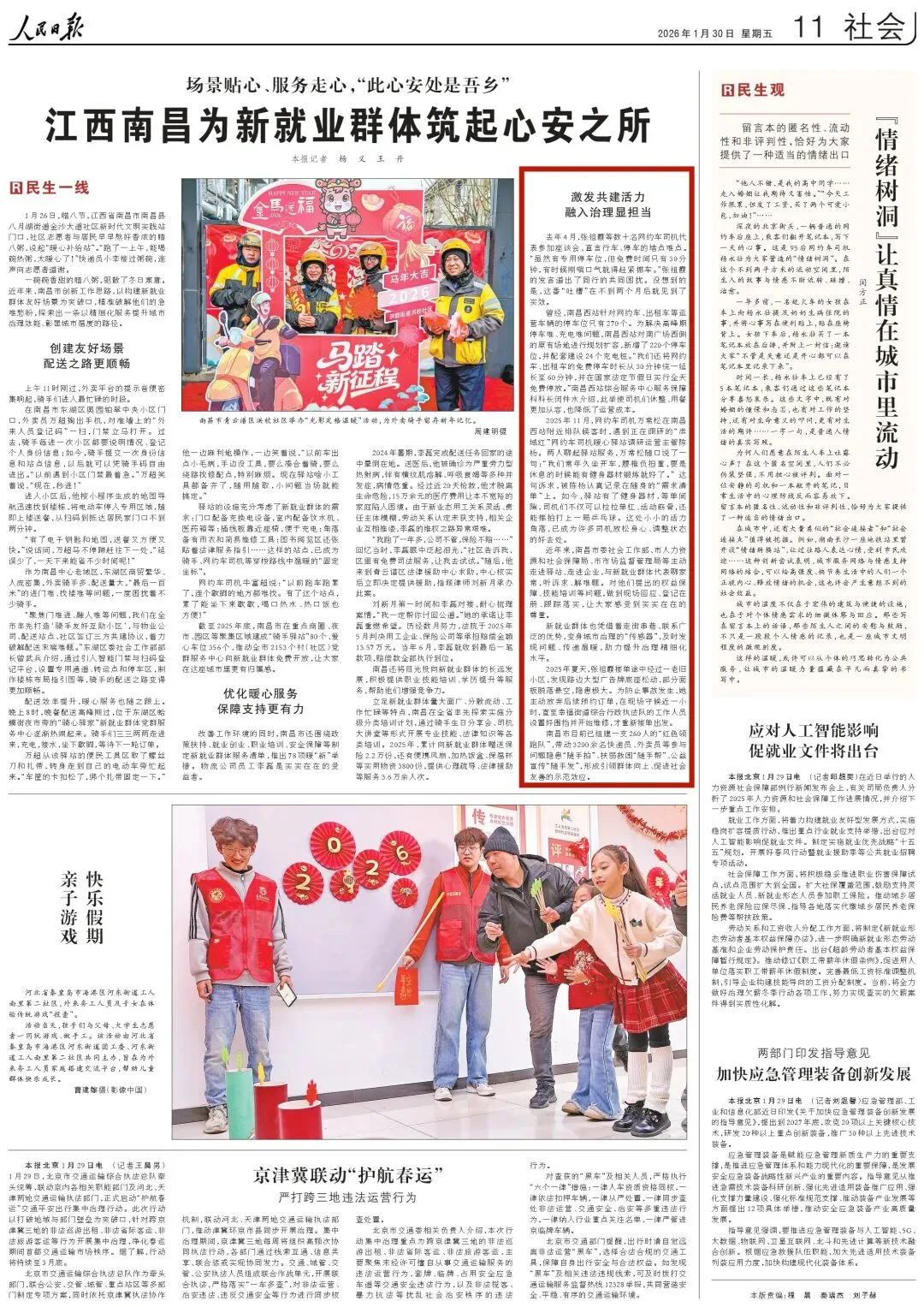 2026年1月30日,《人民日报》刊发《场景贴心、服务走心,“此心安处是吾乡” 江西南昌为新就业群众筑起心安之所》报道,聚焦南昌市近年来创新工作思路,以构建新就业群体友好场景为突破口,精准破解他们的急难愁盼,探索出一条以精细化服务提升城市治理效能、彰显城市温度的路径。其中“激发共建活力,融入治理显担当”一节中,重点介绍了红谷滩区针对网约车司机现实困境,创新“驿站+服务+治理”模式。去年十一月份,南昌西站“洪城红·红谷红”网约车司机暖心驿站获评全国可复制推广司机驿站,今年初央视《新闻直播间》、新华网都陆续做了报道,此次《人民日报》再次报道,也标志着南昌西站网约车提升改造创新实践持续获得主流媒体高度认可。