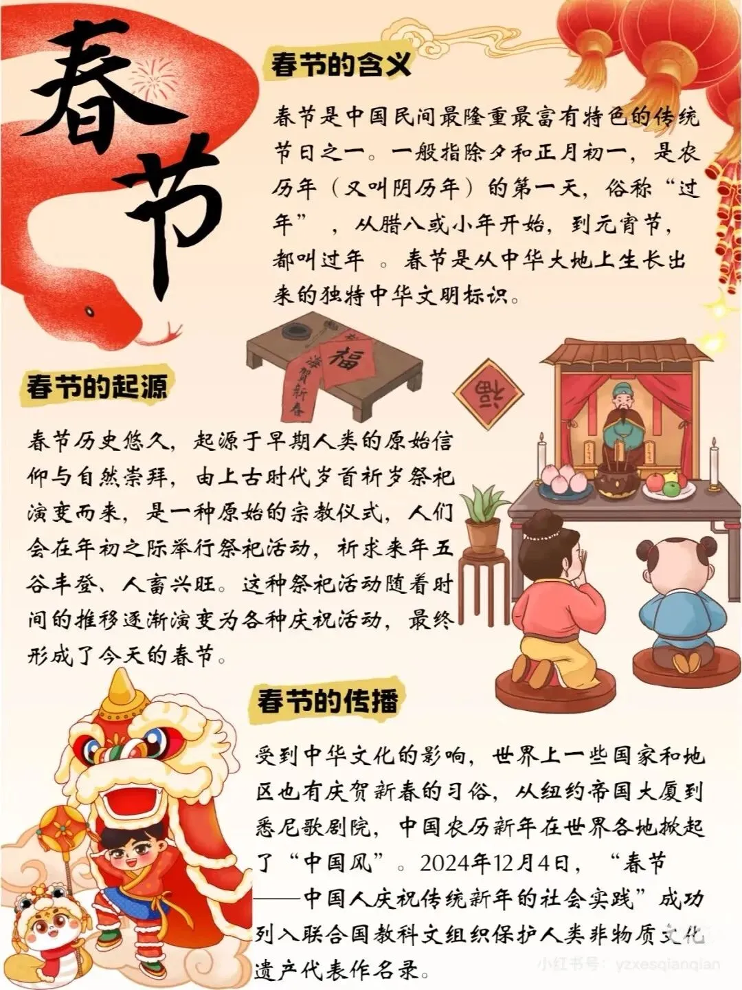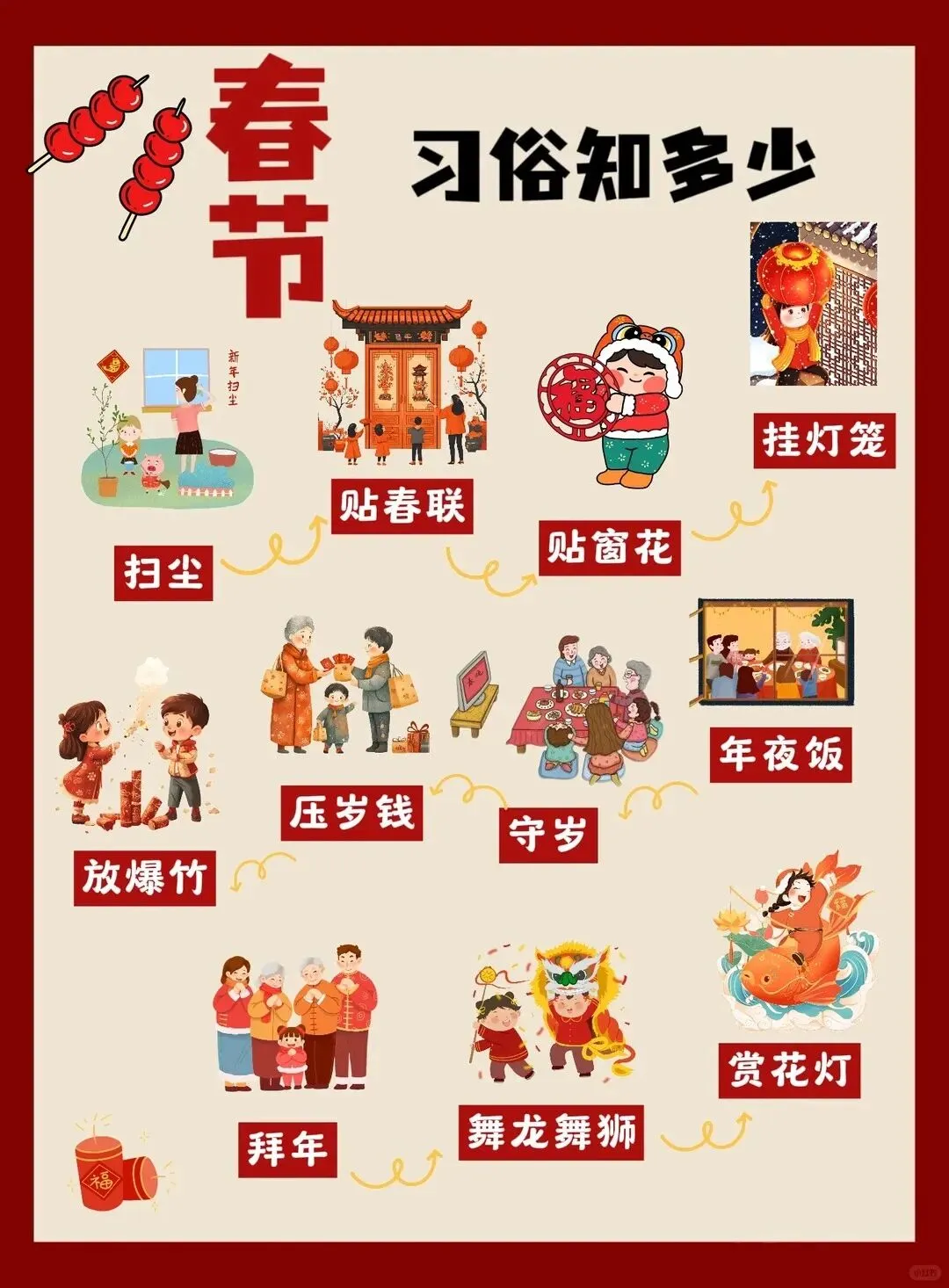 春节是我们中国最重要的节日!它代表着新一年的开始,也是一家人团聚在一起的欢乐时刻呢❤️ 那我们一起了解下春节的习俗有哪些吧:
