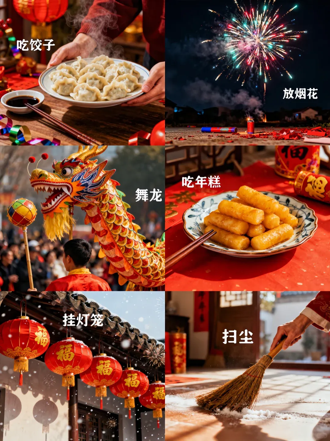 🏮挂灯笼 红彤彤的灯笼一挂,年味儿瞬间就浓了!灯笼象征着团圆和喜庆,也盼着新的一年红红火火。 🐉舞龙闹春 锣鼓一响,祥龙起舞,这可是新年最热闹的场面啦!舞龙不仅讨个“行大运”的好彩头,也让节日的气氛更嗨~ 🎆放烟花 夜空里炸开的烟花,是新年最美的开场白!看着漫天绚烂,感觉所有的美好都在向自己奔赴而来~ 🥟吃饺子 “新年吃饺子,来年不冻耳”,白白胖胖的饺子像元宝,咬一口,把福气和财气都吃进肚子里🍴 🍡吃年糕 “年糕年糕,年年高”,软糯香甜的年糕,是对新一年“步步高升”的美好期盼呀~ 这些习俗里,藏着中国人对新年最质朴的祝福,也让新年变得更有温度❤️