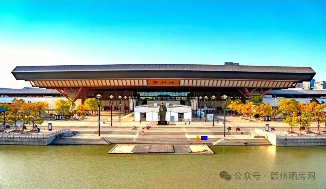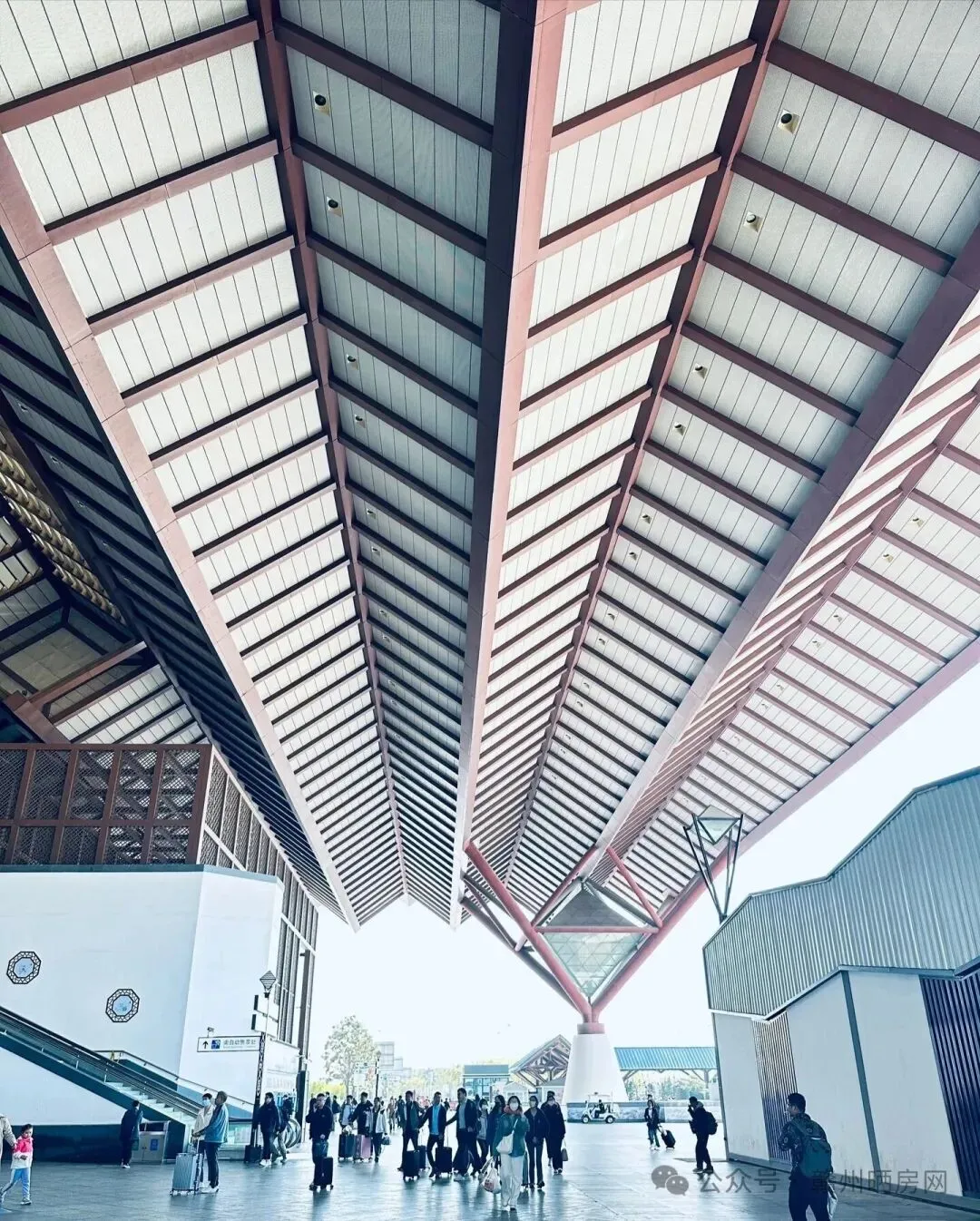 苏州站:屋面举折、大幅向主体建筑外延伸、屋面和雨棚风格一统、采用重檐增添层次感。