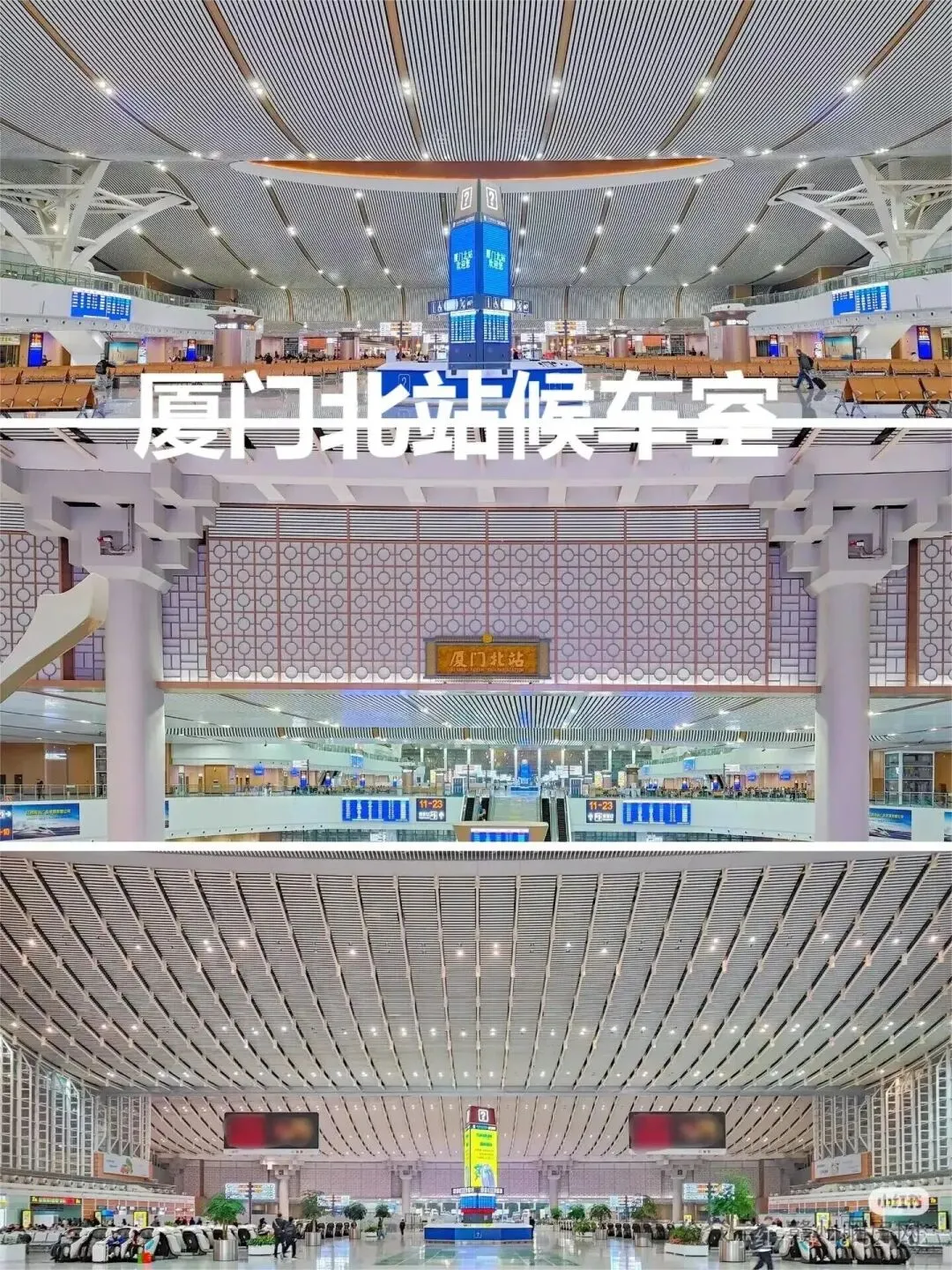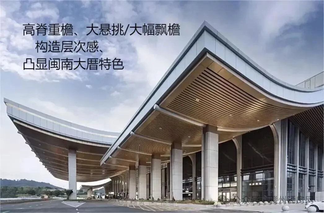 厦门北站:高脊重檐、大悬挑结构层次分明、候车室桁架结构暴露、主空间无柱开阔。车站整体为波浪形。